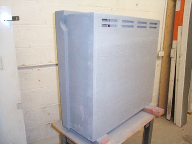 Now that all the sanding is done, and the resulting dust removed; the bodywork required to fix years of abuse can start. Standard 2 part automotive body putty is used on all the larger damage (Figure 4.33 – 4.37). Some areas require multiple build coats, and sanding between each coat. On many cabinets I find entire sides affected with very large divisions in the plywood grain, large enough that your fingernail will drop in. This damage is caused by years of cold storage. These cannot be hidden with paint, in fact, fresh paint will cause them to become even more prominent. On this type of fine damage I use a premix auto body glazing finishing compound, and skim coat the whole cabinet. Once all damage is repaired, the entire cabinet receives one final pass with the 220 grit paper.