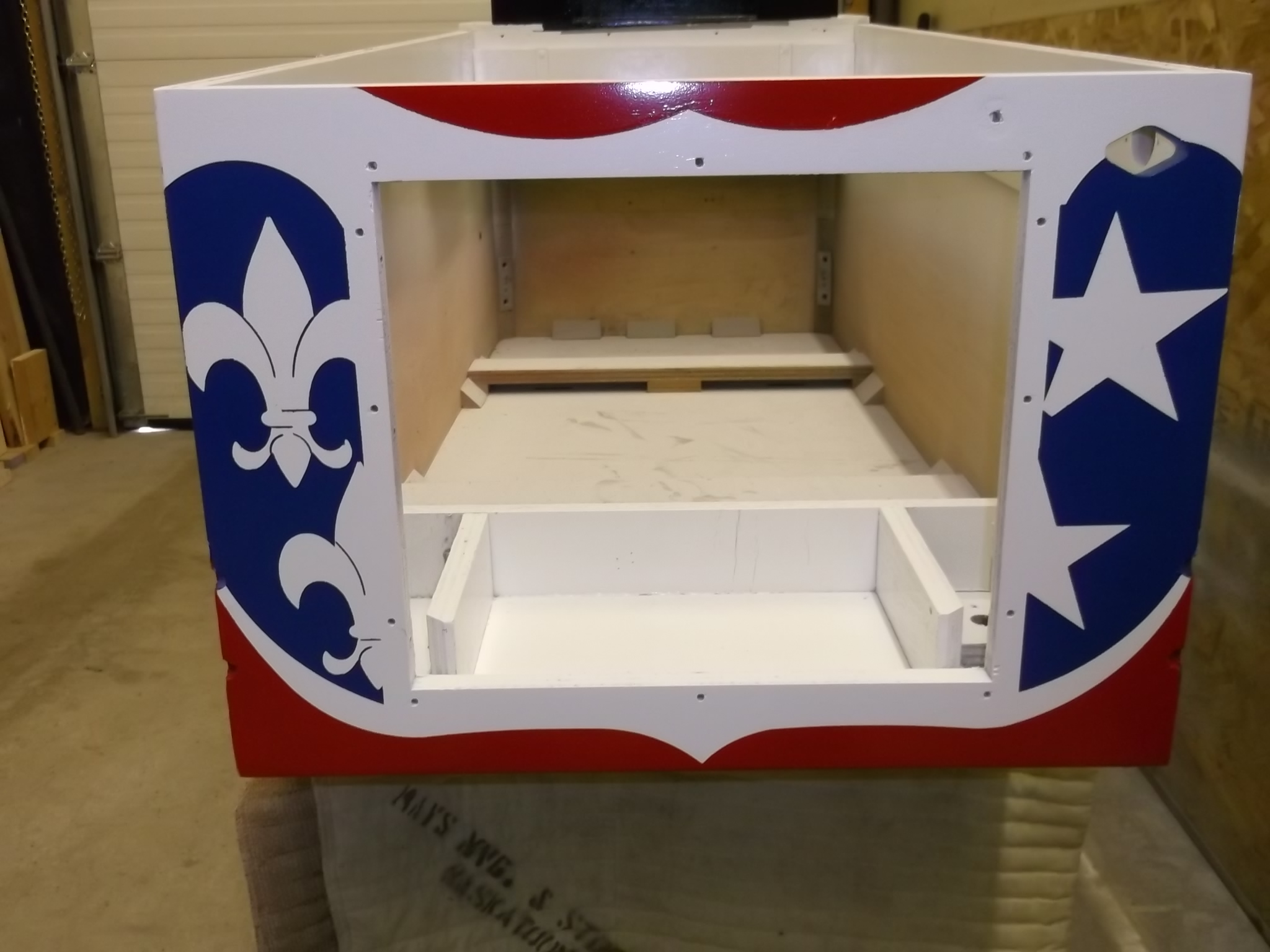 The first step is the cabinet has to be stripped bare and cleaned (Figure 4.1 – 4.4). I always start on the underside of the cabinet. Most time I find the wooden plywood edges are broken or separating from years of poor handling when the pin was loaded in and out of truck beds (Figure 4.5 – 4.9). To repair this, the damaged area need to be squared off, then plywood needs to be cut to fit the missing section. It is then glued and clamped into place (Figure 4.10 – 4.18). Once set, it can be sanded flush to the surrounding wood with a orbital sander.